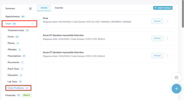 Click to expand the Chart/EMR tab. This will reveal the "Client Problems" sub-tab. Diagnoses created from the treatment form are stored as Client Problems (client-level problems).