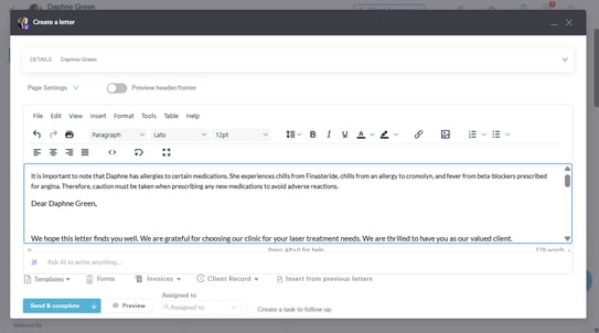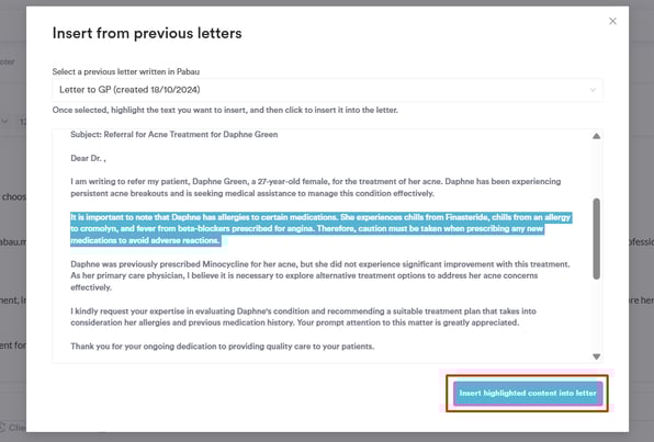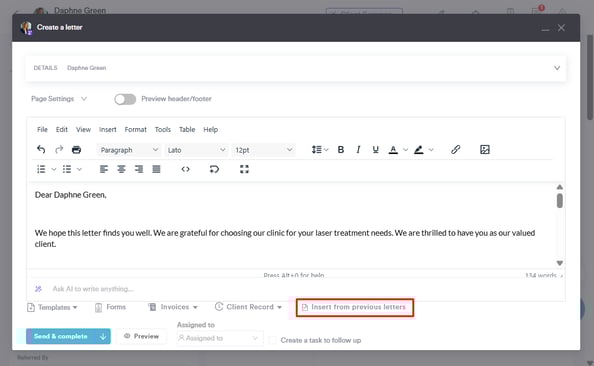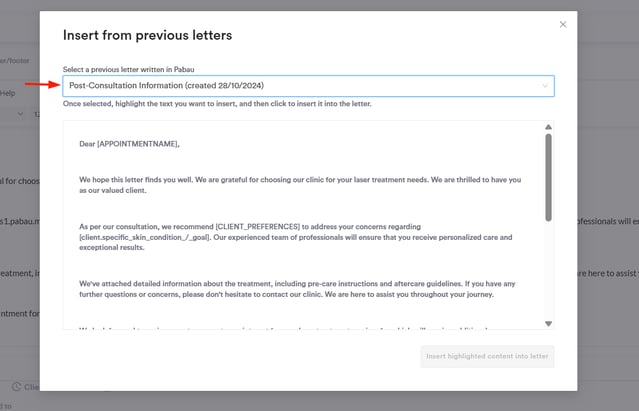 Select a previous letter written in Pabau from the first field. By clicking this option, a dropdown will show all previous letters, which you can choose from.