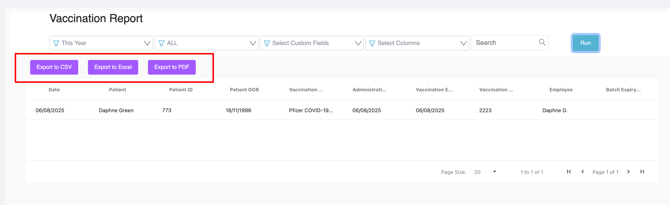 Once you have set all your filters, click the Run button to generate the report. The system will display a table containing all vaccination records that match your selected criteria.