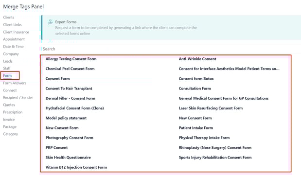 Form merge tags allow businesses to send specific forms directly to clients via messages. This can include consent forms, medical history questionnaires, or photography consent forms, making it easy to personalise communication and collect client information efficiently.