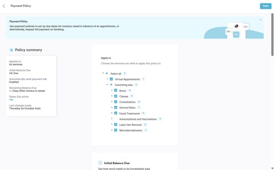 Payment Policy in Pabau helps clinics set clear expectations for payments, ensuring clients understand deposit and payment requirements before appointments.