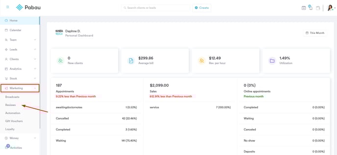 Log in to your Pabau account, and in the left sidebar menu, click on Marketing, then on "Reviews".