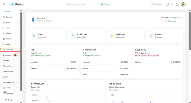To access SMS campaigns in Pabau, navigate to the Marketing tab located on the left sidebar menu and click to expand it. There you'll find the "Broadcasts" sub-tab. On the SMS tab at the top of the screen, all SMS campaigns you've created will show.