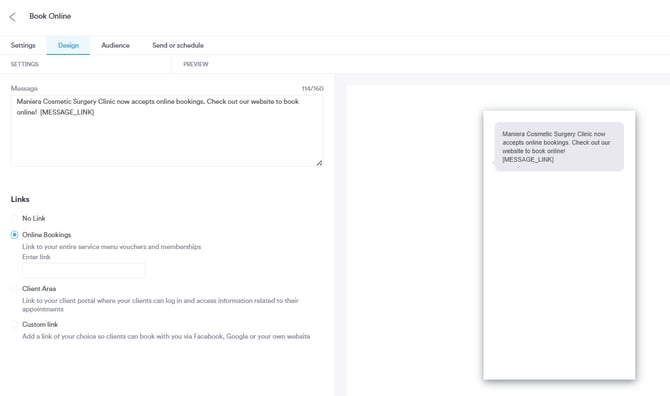 Adding a relevant link helps guide clients directly to the next step — such as your Online Booking page, their Client Portal, or a custom landing page you’ve created for your campaign. Always use only one link per message to avoid confusion and keep the text clean.